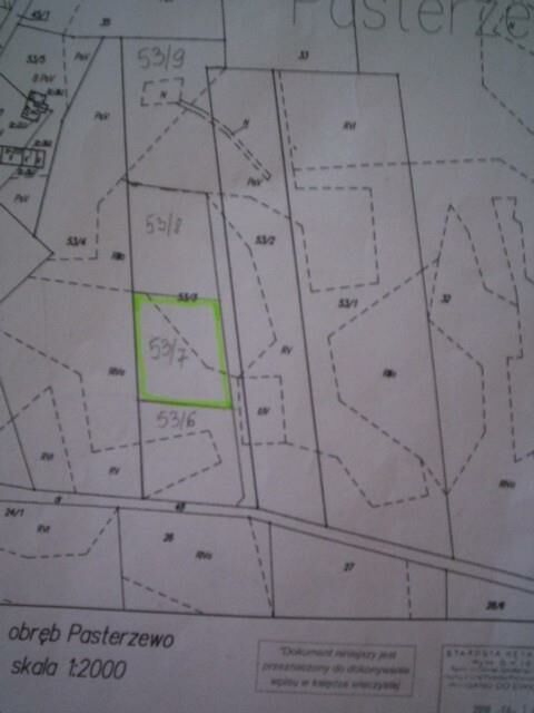 Działka nr 53/7, obr Pasterzewo podzielona na 3 działki o pow. 1000m2 Działki w w kształcie prostokąta o powierzchni 3000m2, z lekkim nachyleniem w kierunku jeziora, na której rośnie trawa.
